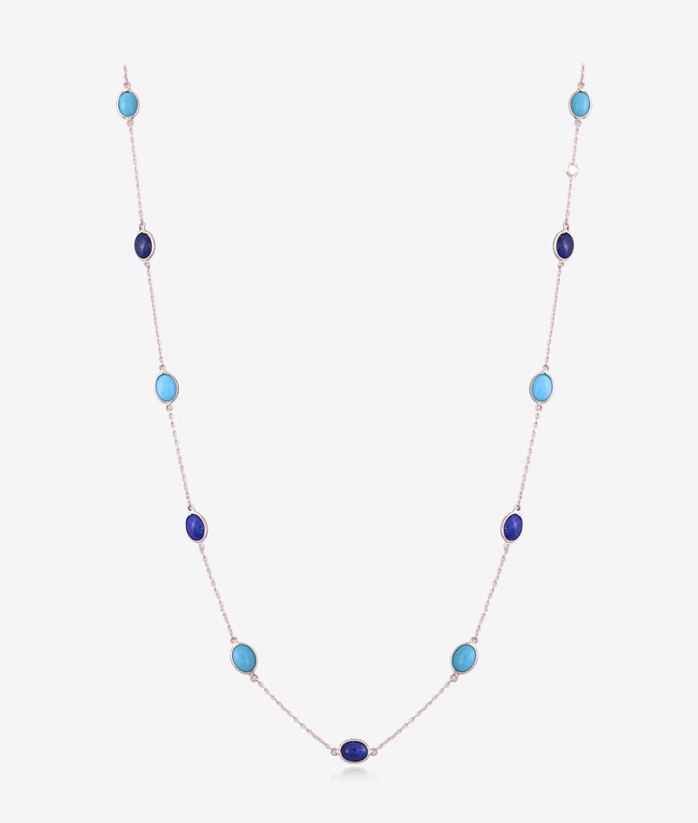 The Twilight Duo Lapis & Turquoise Chain features semi-precious lapis and turquoise beads set in a close design, offering a harmonious blend of deep blue and vibrant teal tones for elegant, versatile everyday wear.
